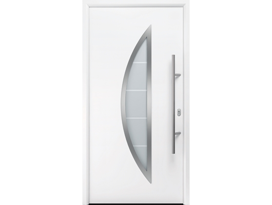 Входная дверь Hormann Thermo 65 Мотив 900. Гладкое стальное полотно Трехслойное изоляционное остекление: снаружи многослойное безопасное стекло VSG – Float, подвергнутое пескоструйной обработке с 4 прозрачными полосами – внутри однослойное безопасное стекло ESG. Рама остекления из нержавеющей стали. Ручка HB 38-2